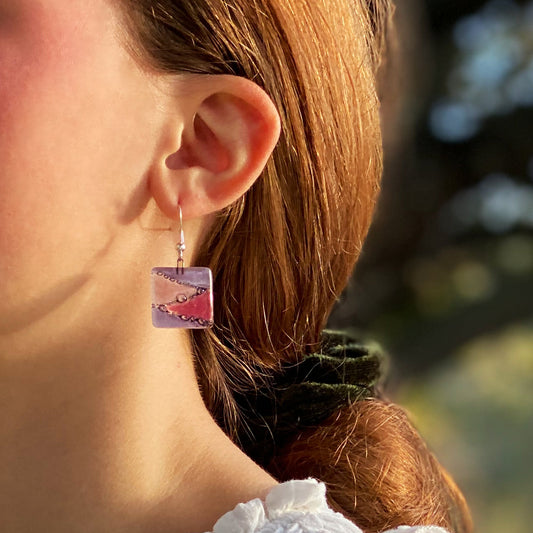 Square Glass Dangle Earrings, Zig Zag Purple & Pink - Tili Glass