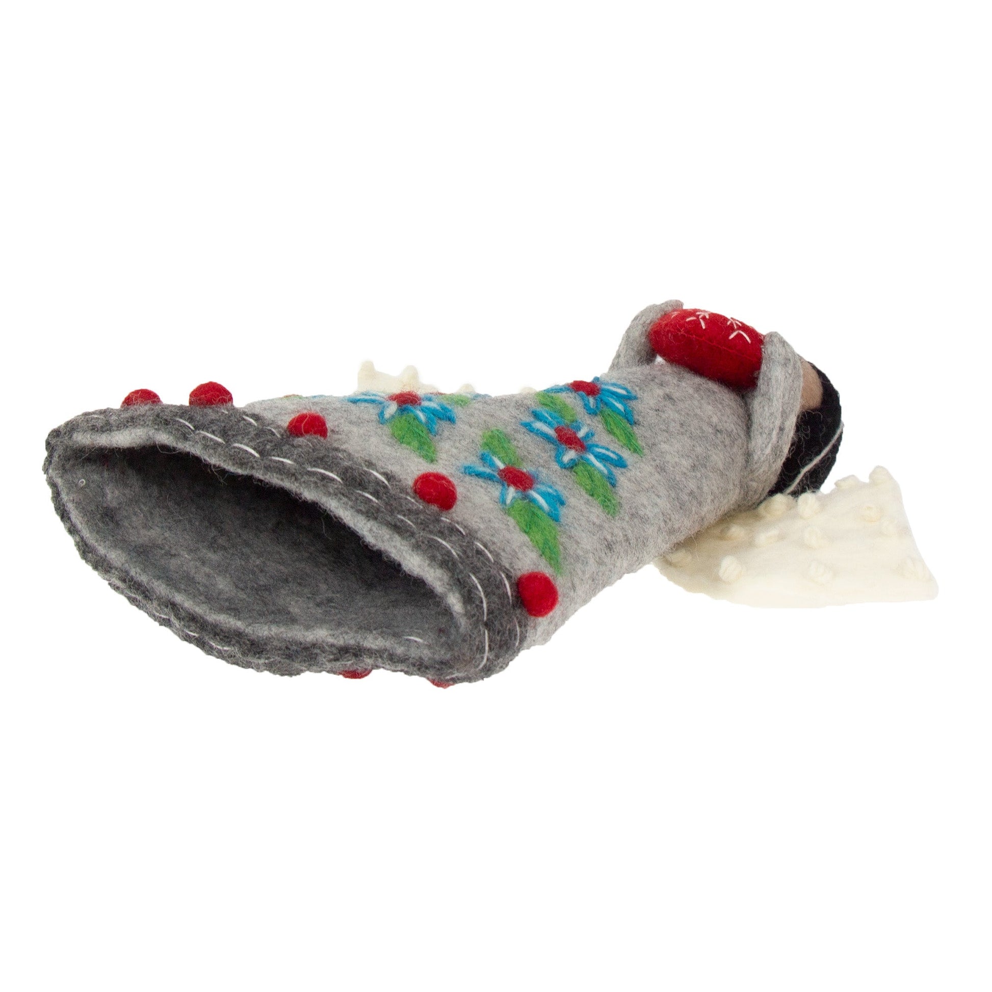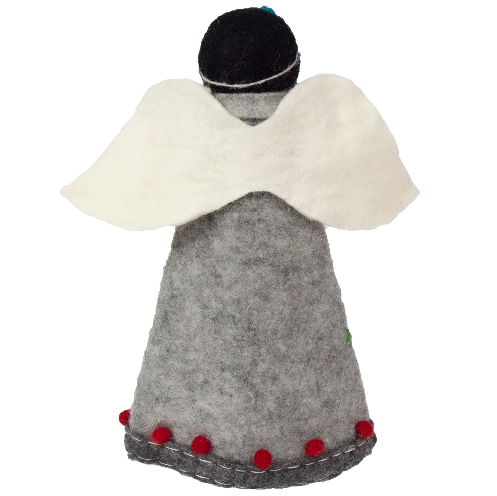 This beautiful and elegant angel is the perfect accent to the Christmas Tree -- a stunning tree topper OR perfect for a tabletop decoration! Lovingly crafted by mother and sister artisans in Nepal. Eco-friendly wool felt. Measures approximately 10.5 inches tall. Azo-free dyes. Fair Trade. The Art of Felting: The first step to creating these beautiful felt pieces begins with gathering some of the world’s finest sheep’s wool from New Zealand. Making felted wool is an ages-old, time-consuming process of bonding fabric with fiber. This is a physical job where the artisan’s scrub, rub, roll and rinse the wool again and again with soapy water. Once the wool is bound into a sheet and the desired thickness is complete, the felt is laid out to dry. From there, the felt wool is cut and re-worked into many complex shapes and designs. The many sheets of wool might merge several colors to create patterns and layers. This takes a well-trained, talented artisan and is a true labor of love. The end results are colorful, one-of-a-kind textiles that are stunning to behold.