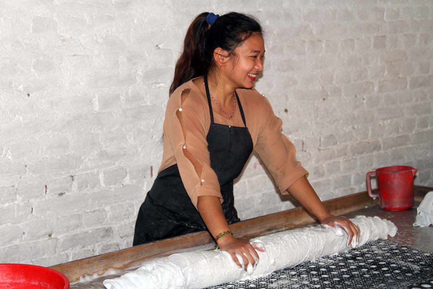The first step to creating these beautiful felt pieces begins with gathering some of the world’s finest sheep’s wool from New Zealand. Making felted wool is an ages-old, time-consuming process of bonding fabric with fiber. This is a physical job where the artisan’s scrub, rub, roll and rinse the wool again and again with soapy water.