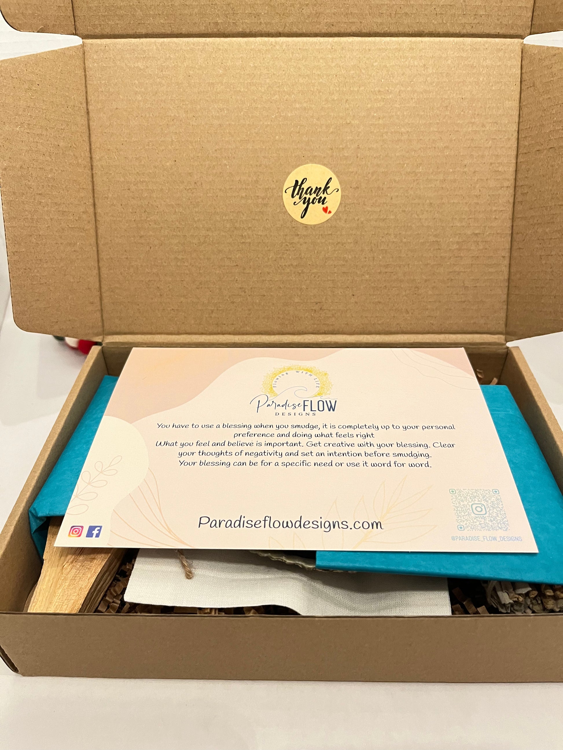 Organic Sage Bundle, Palo Santo Sticks, Selenite Wand, Abalone Shell; matches in small glass jar, Smudging Guide; travel bag.